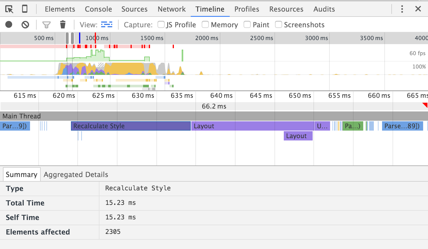 查看大量Recalculate Style[重新计算样式]事件的录制(以紫色显示)。